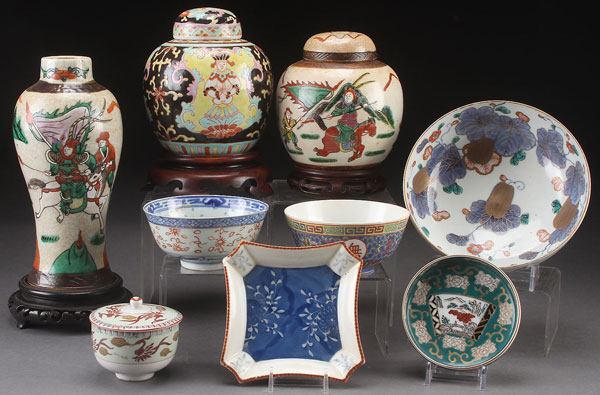 A NINE PIECE GROUP OF ORIENTAL PORCELAIN, 20TH CENTURY. Including enameled vases, lidded jars, and Kutani bowls. Largest height 9 inches (23 cm).
