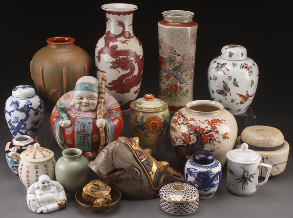 A GROUP OF ORIENTAL PORCELAIN DECORATIVE ARTS, 20TH CENTURY. Over 20 pieces including a large figural Hotei, vases, jars, and other items. Largest height 12.5 inches (32 cm).