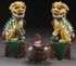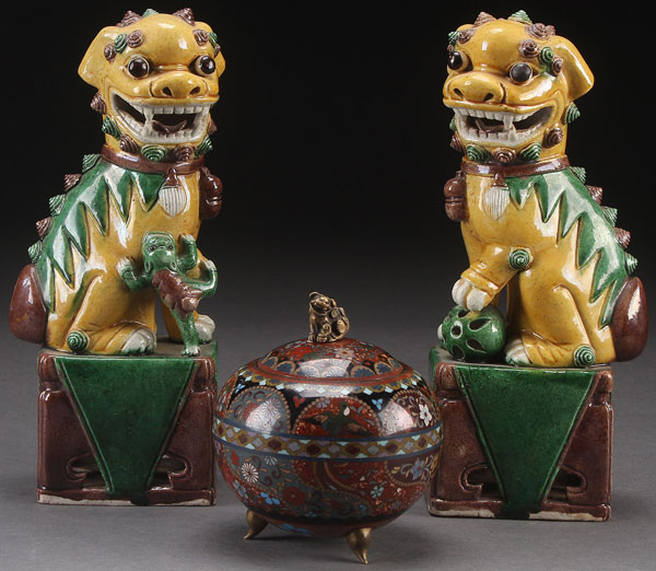 A PAIR OF CHINESE SANSEI GLAZED FOO DOGS, CIRCA 1900. Together with an oriental cloisonné lidded jar with bronze Foo dog finial. Largest height 9.5 inches (24 cm).