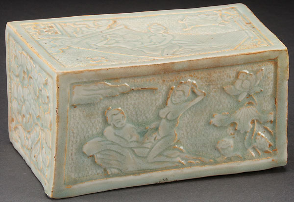 A CHINESE PALE CELADON GLAZED PORCELAIN HEADREST. With embossed erotic scene. Length 7.75 inches (20 cm).