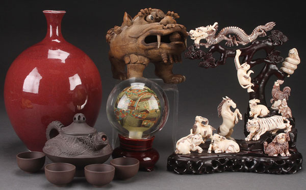 A GROUP OF ORIENTAL DECORATIVE ARTS, 20TH CENTURY. Comprising a contemporary red glazed bottle vase, a dragon ware pottery tea set, a large hand modeled pottery beast, a reverse painted glass sphere on stem and a faux ivory menagerie display of Zodiac creatures. Largest height 10 inches (25.5 cm).