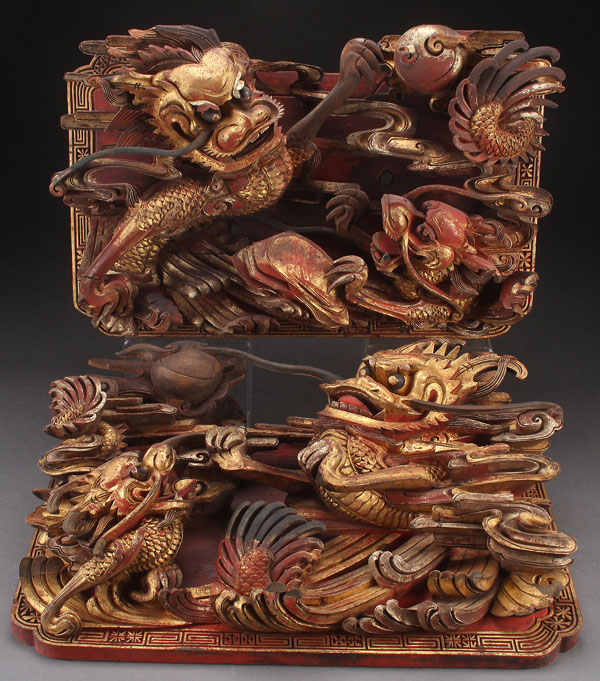 A PAIR OF LARGE CHINESE CARVED WOOD ARCHITECTURAL BRACKETS, 20TH CENTURY. Each carved in deep extending relief with dragons, finished in parcel gilt. Length 22.5 inches (57 cm), height 13.5 inches (34 cm).