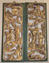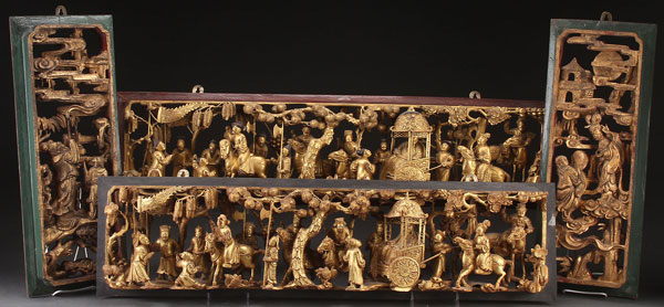 A GROUP OF FOUR CHINESE CARVED AND GILT WOOD PANELS, 20TH CENTURY. Comprising a horizontal pair carved with a royal procession with chariots, attendants, and horsemen, and a vertical pair carved with Kwanyin and attendant in cloud forms below pavilions. Largest length 37.75 (95.5 cm) inches, width 9.5 inches (24 cm), depth 3.5 inches (9 cm).