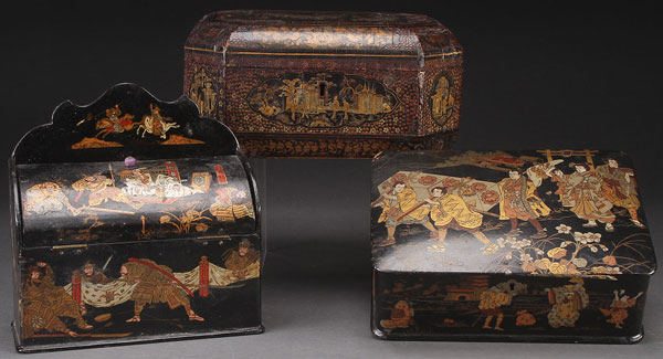 A GROUP OF THREE ENGLISH BLACK LACQUER PAPIER-MÂCHÉ BOXES, 19TH CENTURY. Each with gilt Japonaise decoration. Comprising a hinged front letter box, and two dresser boxes. Largest length 10 inches (26 cm).