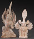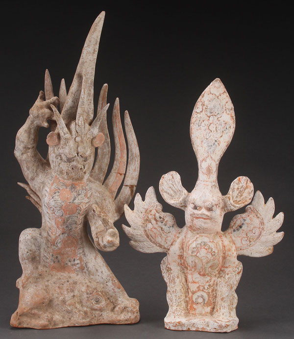 A PAIR OF CHINESE HAN STYLE POLYCHROME TERRA COTTA CEREMONIAL TOMB FIGURES. Each with remnants of red oxide and brown decoration over white pigment, in the form of mythical figures. Largest height 17.75 inches (45 cm).