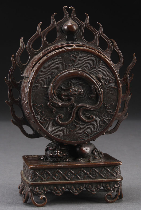 A CHINESE BRONZE CENSER, PROBABLY REPUBLIC PERIOD. On raised base with Foo lion supporting a drum form with relief molded dragon and fitted lid. Height 6.25 inches (16 cm).