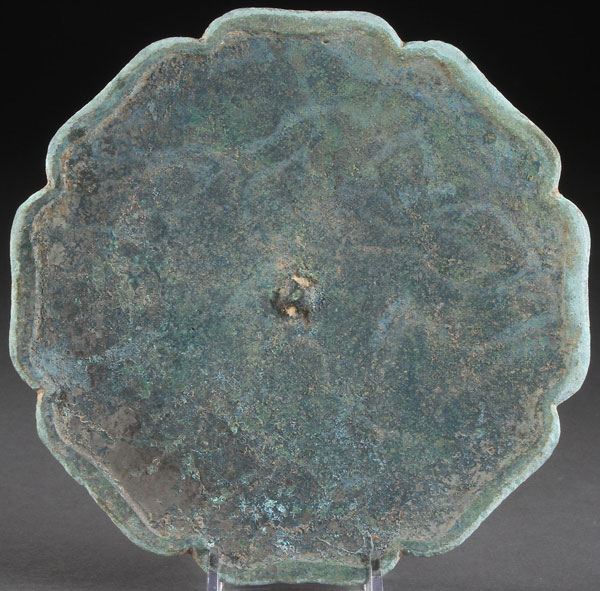 A CHINESE MING STYLE BRONZE MIRROR. Of lotus form with heavy encrustation and verdi gras patina, remnants of fiber handle in suspension loop. Diameter 6.75 inches (17 cm).