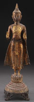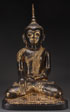 A PAIR OF TIBETAN BUDDHAS, 19TH/20TH CENTURY. Comprising a large Tibetan papier-mâché Buddha depicted in seated form with an ebonized and parcel gilt finish, raised on a later conforming wood base. Height 25.75 inches (65.5 cm). And a Tibetan parcel gilt iron figure of Buddha, perhaps earlier than 19th century, raised on a stepped lotus plinth with red oxide and gilt finish, later mounted on a probably French gilt bronze footed stand. Some repair. Total height 17.25 inches (44 cm).