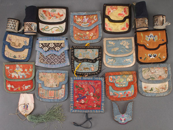 A 19 PIECE GROUP OF CHINESE AND KOREAN EMBROIDERED TEXTILE GROUP, 19TH/20TH CENTURY. Comprising various pouches, cases, and two pairs of bound feet heels. Largest approximately 5 inches (13 cm) square.