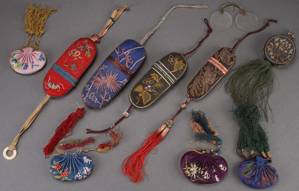 A NINE PIECE GROUP OF CHINESE AND KOREAN EMBROIDERED TEXTILES, 19TH/20TH CENTURY. Comprising four eye glass cases and five pouches. Largest length 7 inches (18 cm) excluding tassels.