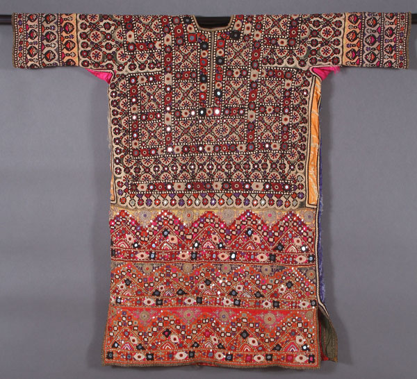 AN ETHNIC WOVEN AND EMBROIDERED TEXTILES GROUP, 20TH CENTURY. From several cultures. Including an Afghanistan wedding jacket finely stitched and quilted shirt embellished with mirrored tiles, an embroidered black silk jacket, and a woven pleated skirt with cross stitched designs. Largest length 35 inches (89 cm).