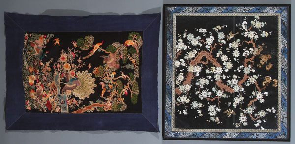 A LARGE CHINESE EMBROIDERED SILK PANEL, LATE 19TH/EARLY 20TH CENTURY. Depicting flowering prunus and birds on a black silk embroidered ground and embroidered border with Buddhist symbols. Together with a later Oriental embroidered silk panel depicting peacock and other birds of various type. Largest 32 inches (81.5 cm) square.