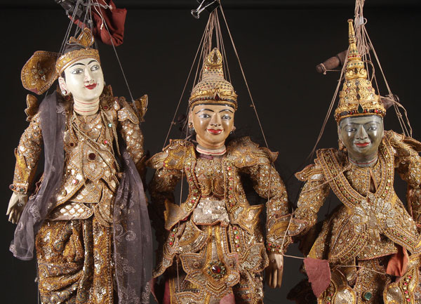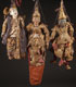 A GROUP OF THREE BURMESE MARIONETTES, 20TH CENTURY. Each in carved wood and gesso with painted features and elaborate stitched gowns with sequined beading and jewelry. Largest length approximately 40 inches (102 cm).
