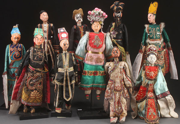 A GROUP OF 10 CHINESE THEATRICAL COSTUME PUPPETS, 20TH CENTURY. Jointed wood with polychrome features, each dressed in elaborately embroidered court robes with silver and gilt threading. Largest length approximately 18 inches (46 cm).