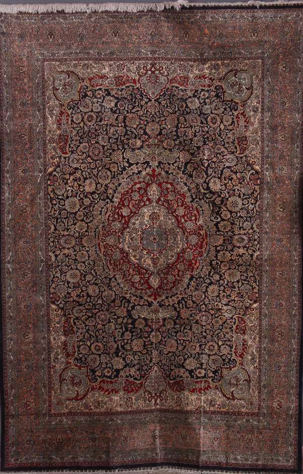A VERY FINE HAND WOVEN SILK TABRIZ ORIENTAL CARPET, 20TH CENTURY. Finely woven stylized floral borders and central medallion on an ivory ground. 108 inches x 71 inches.