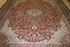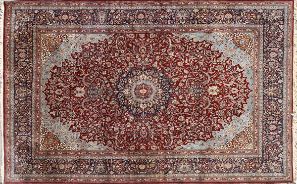 A VERY FINE ROOM SIZED KASHAN CARPET, LAST HALF 20TH CENTURY. Tightly woven with a large dark blue medallion on a maroon ground with stylized foliates. 170 inches x 119.5 inches (432 x 304 cm).