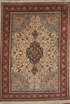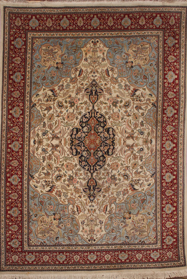 A HAND WOVEN TABRIZ ORIENTAL CARPET, 20TH CENTURY. With figural animal, floral pattern and cobalt blue central medallion on an ivory ground. 132 inches X 99 inches.