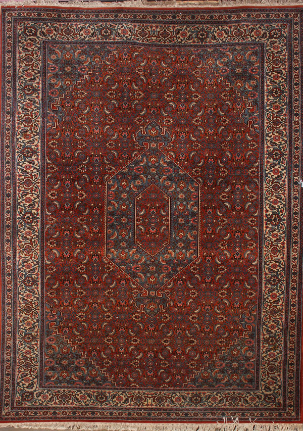 A HAND WOVEN ARDABIL ORIENTAL CARPET, 20TH CENTURY. With stylized geometric designs on a burgundy ground. 124 inches x 87 inches.