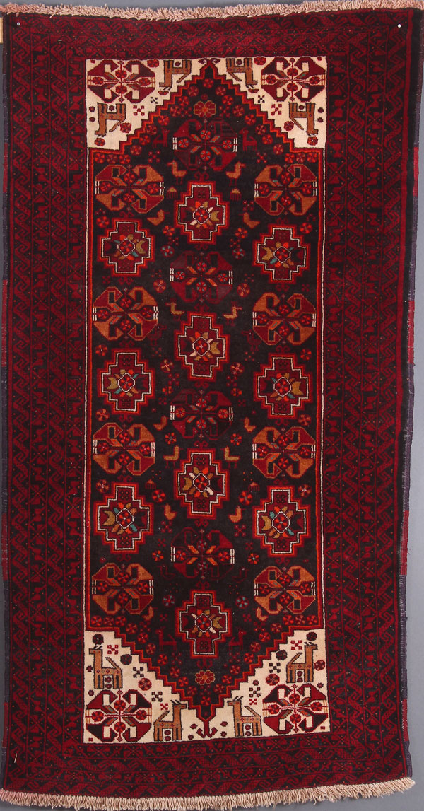 A HAND WOVEN BELOUCH ORIENTAL RUG, 20TH CENTURY. With geometric designs on a burgundy/red ground. 78 inches x 42 inches.