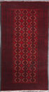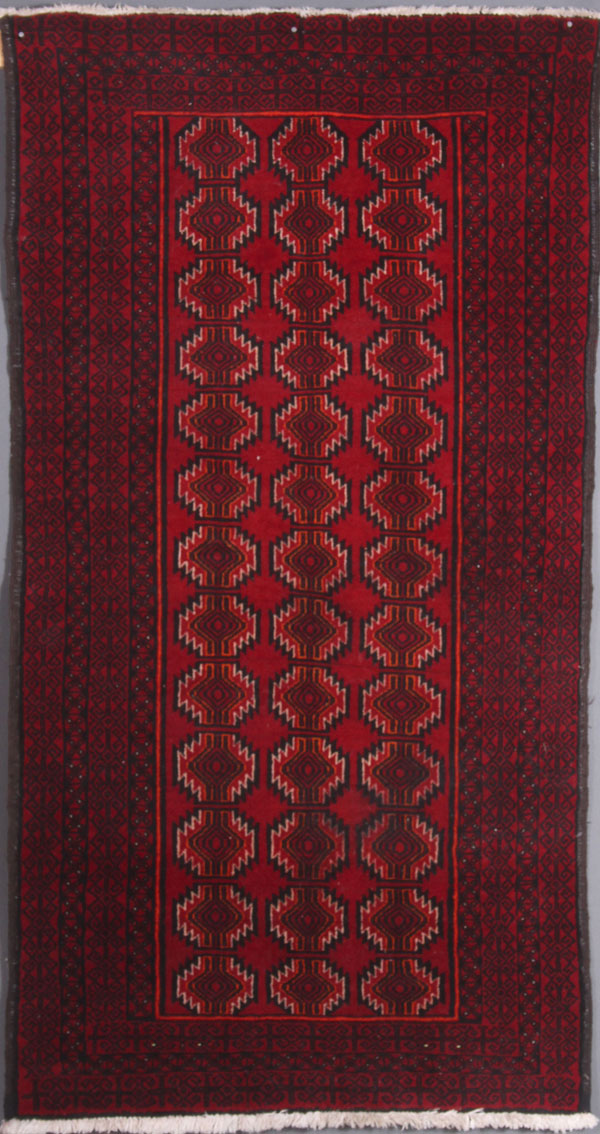 A HAND WOVEN BELOUCH ORIENTAL RUG, 20TH CENTURY. With stylized geometric designs on a red/burgundy ground. 75 inches x 40 inches.