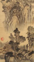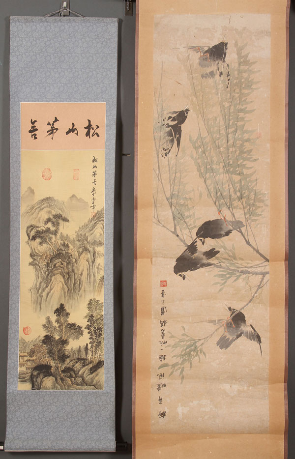 TWO CHINESE SCROLLS. Comprising a scroll depicting mountains and bonsai trees, image 38 inches x 11.25 inches (97 x 28.5 cm) and a scroll depicting Dao Shuan, image 54.5 inches x 15 inches (138.5 x 38 cm).