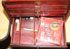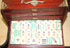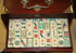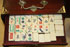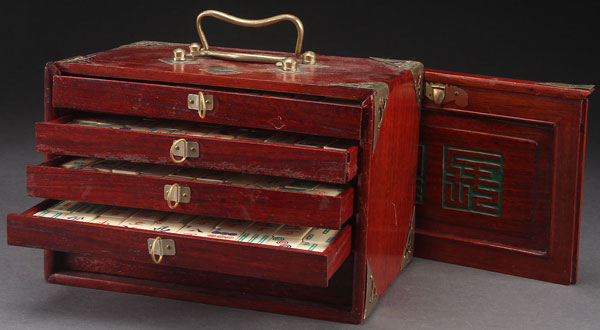 A CHINESE MAHJONG SET, 20TH CENTURY. In mahogany case with five drawers containing incised polychrome bone and bamboo tiles. Length 9.25 inches (24 cm).