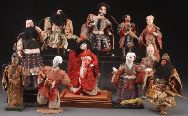 A COLLECTION OF 11 JAPANESE NINGYO DOLLS, EARLY TO MID 20TH CENTURY. Depicting various samurai, cultural heroes, and other figures, dressed in period style clothing. Largest height 11 inches (28 cm).