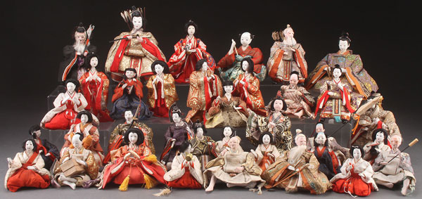 A LARGE COLLECTION OF JAPANESE NINGYO DOLLS, 20TH CENTURY. Approximately 35, each with gofun faces and inset glass eyes, dressed in period style clothing. Largest height 7 inches (18 cm).