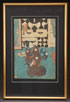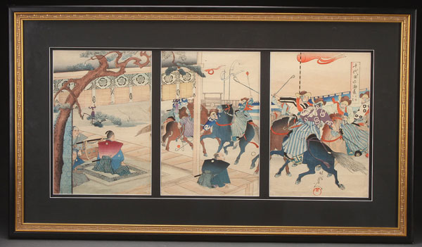 A JAPANESE WOODBLOCK PRINT (KABUKI PLAY) BY KUNIYOSHI. Together with a woodblock triptych polocrosse game by Shika Nobu, circa 1900. Largest 22.25 inches x 38.75 inches (56.5 x 98.5 cm) overall.