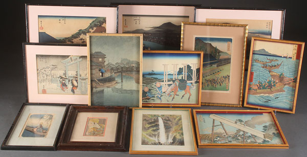 A GROUP OF 23 ORIENTAL DECORATIVE PRINTS, 20TH CENTURY. Including woodblocks and lithographs, of various sizes, all framed. The majority Japanese after known artists. Largest 30.75 inches x 12.25 inches (78 x 31 cm) overall.