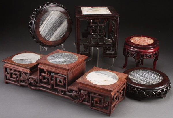 FIVE CHINESE CARVED WOOD AND MARBLE DISPLAY STANDS, 20TH CENTURY. Of various shape in rosewood with gray marble inserts. Largest length 23 inches (59 cm).