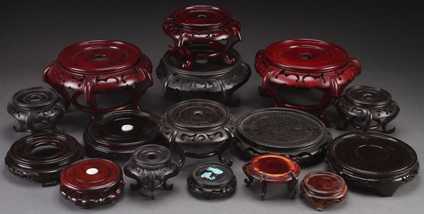 A GROUP OF 16 CHINESE CARVED HARDWOOD STANDS, 20TH CENTURY. Including mahogany and ebonized wood. Largest diameter 8.25 inches (21 cm).