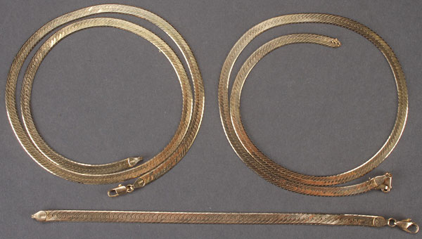 A THREE PIECE 14 K YELLOW GOLD HERRINGBONE NECKLACES AND BRACELET GROUP, 20TH CENTURY, ITALIAN. Comprising a matching 24 inch necklace, 20 inch necklace (needs clasp repair), and 8 inch bracelet. Total weight .93 troy ounces.