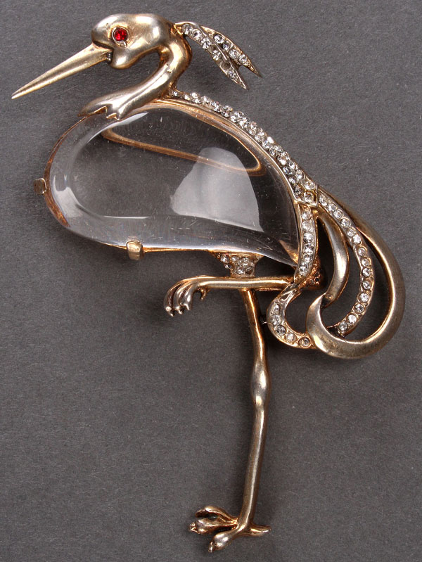 A LADIES TRIFARI STERLING-GILT “GREAT BLUE HERON” BROOCH, CIRCA 1943. The silver-gilt frame modeled as a Heron standing on one leg with a polished clear Lucite body, inset rhinestones and round cut red stone eye, the verso stamped “Sterling, Trifari, Des. Pat. N. 135175”. Length 3.25 inches (82 mm).