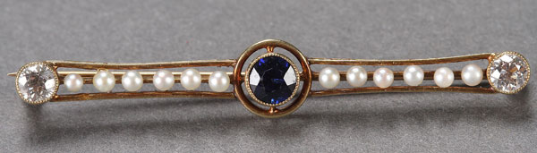 A LADIES 14K GOLD, SAPPHIRE , DIAMOND AND PEARL BAR PIN, FIRST HALF 20TH CENTURY. Containing a round cut faceted blue sapphire of good quality approximately 4.5 mm and approximately .35 cts flanked by twelve 2 mm pearls and two approximately .25 ct European cut bezel set diamonds of good quality and color. Apparently unmarked. Length 2 inches (52 mm).