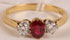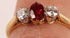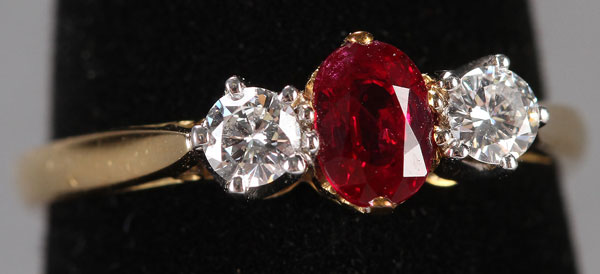 A FINE LADIES 18K GOLD, RUBY AND DIAMOND RING BY GARRARD & CO, 20TH CENTURY, LONDON. Containing a claw set approximately 6 x 4 mm oval cut ruby of good quality and two brilliant cut diamonds approximately .125 carats each. Stamped hallmarks.