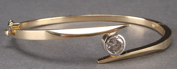 A LADIES 14K GOLD AND SOLITAIRE DIAMOND BRACELET, LATE 20TH CENTURY. Containing an approximately .98 carat brilliant cut diamond of pale champagne color. Inside diameter 2.25 inches, total weight 19 grams.