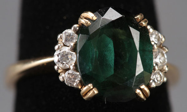 A LADIES 14K GOLD PERIDOT AND DIAMOND RING, 20TH CENTURY. Containing a deep green oval cut peridot approximately 8 x 10 mm and flanked by three round cut diamonds on each side. Stamped 14k, size 4 ¾.
