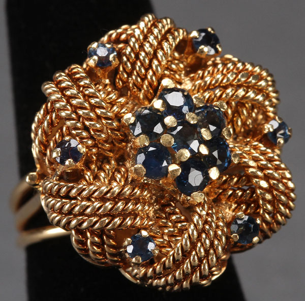 A VERY FINE LADIES 18K GOLD AND SAPPHIRE FASHION RING, 20TH CENTURY. Containing 13 round cut sapphires within a three strand coiled gold wire braided rosette above reticulated petals. Stamped 18k. Weight 14 grams.