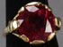 A LADIES 18K GOLD, RUBELLITE, TOURMALINE AND PERIDOT COCKTAIL RING, 20TH CENTURY. Containing an approximately 13.25 x 8.15 mm circular facet cut tourmaline flanked by two bezel set round cut green peridots, stamped 18k, size 6 ½.