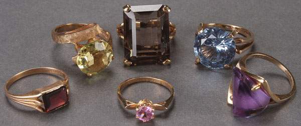 A SIX PIECE LADIES GOLD COCKTAIL AND FASHION RING GROUP, 20TH CENTURY. Containing various colored stones including amethyst, citron, and topaz. Two with slight damage or chips. Total weight approximately .19 troy ounces 14k and .26 troy ounces 10k.
