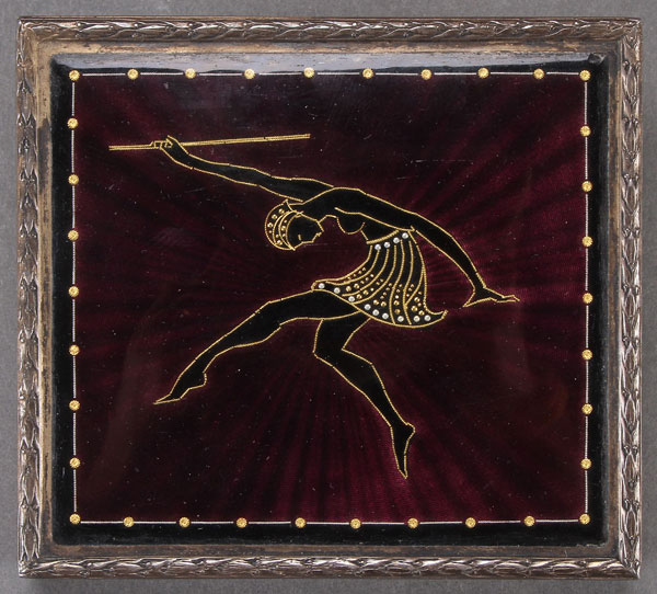 A VERY FINE CONTINENTAL SILVER, GILT &ENAMELED ART DECO VANITY CASE, EARLY 20TH CENTURY. Probably Austria, of squared form with slightly domed hinged lid depicting a silhouetted dancer in black enamel outlined in gilt beading with silver accents on a radiating engine turned ground under translucent amethyst colored enamel within a border of carved lappets. Stamped “.935” and with unidentified makers mark, 3.5 x 3.25 x .75 inches.
