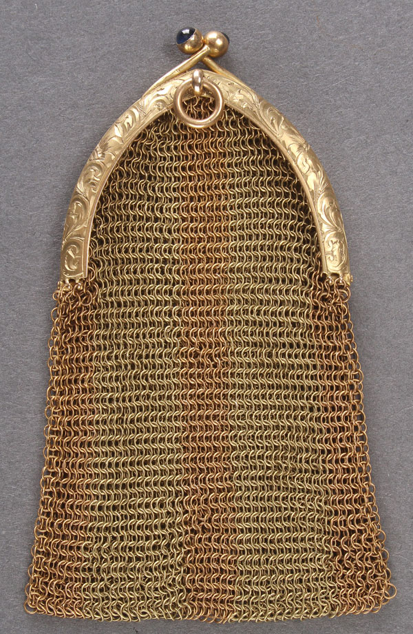 A GOOD LADIES VICTORIAN 14K GOLD COIN PURSE, CIRCA 1900. Two toned baby mesh with a chased arched frame and blue sapphire clasps. Length 3 inches. Weight 23 grams.