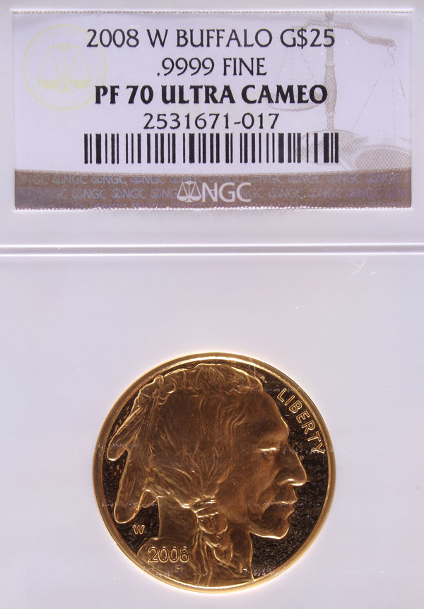 A 2008-W AMERICAN GOLD BUFFALO NGC PF70 ULTRA CAMEO. $25 gold coin, .5 Troy oz. The 2008 coins were the only year the fractional gold Buffalos were produced. One of only 12,169 $25 gold Buffalo proofs minted in 2008.