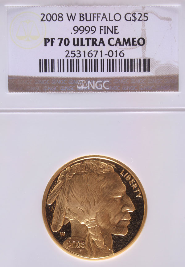 A 2008-W AMERICAN GOLD BUFFALO NGC PF70 ULTRA CAMEO. $25 gold coin, .5 Troy oz. The 2008 coins were the only year the fractional gold Buffalos were produced. One of only 12,169 $25 gold Buffalo proofs minted in 2008.