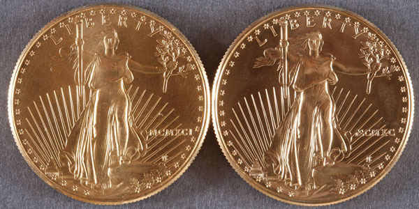 TWO AMERICAN GOLD EAGLES. 1990 and 1991, each $50 1 Troy oz. coins, uncirculated.