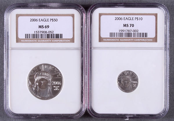 TWO 2006 AMERICAN PLATINUM EAGLES NGC MS69 AND MS70. Comprising a $50 MS69 and a $10 MS70. .60 Troy oz. total.