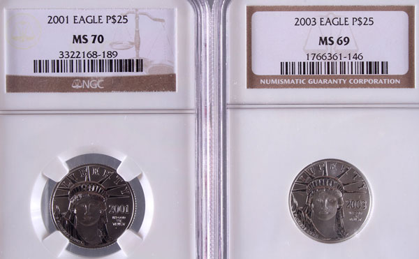 TWO AMERICAN PLATINUM EAGLES NGC MS70 AND MS69. Each $25 platinum coins, comprising a 2001 Eagle NGC MS70 and a 2003 Eagle NGC MS69. .5 Troy oz. total.