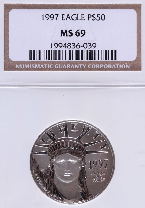 A 1997 AMERICAN PLATINUM EAGLE NGC MS69. $50 platinum coin, .5 Troy oz.