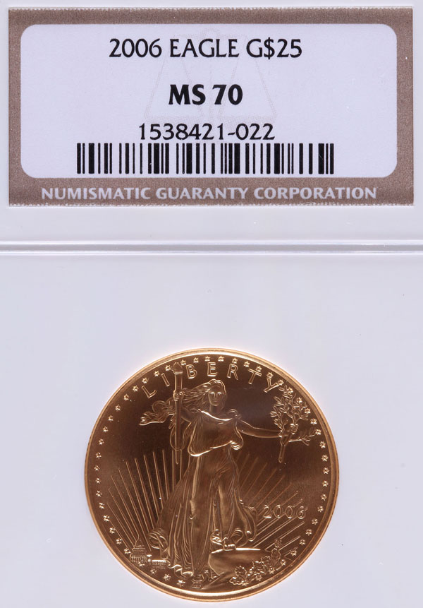 A 2006 AMERICAN GOLD EAGLE NGC MS70. $25 gold coin, .5 Troy oz. gold.